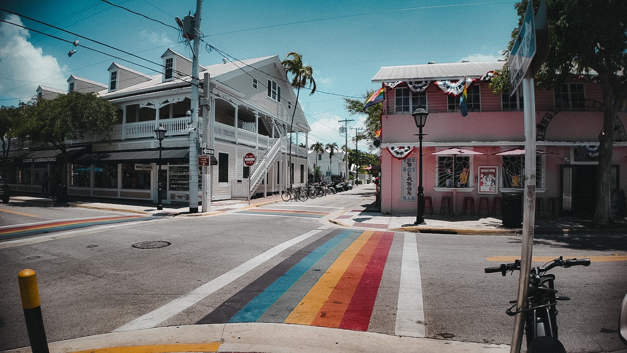 Um quarteirão inteiro com as ruas pintadas nas cores do arco-íris marca o cruzamento da Duval St. com a Petronia St. Esse é o cruzamento mais icônico de Key West, localizado no bairro histórico de Bahama Village, onde a vida noturna prospera e a aura de liberdade da ilha ainda ganha forma.